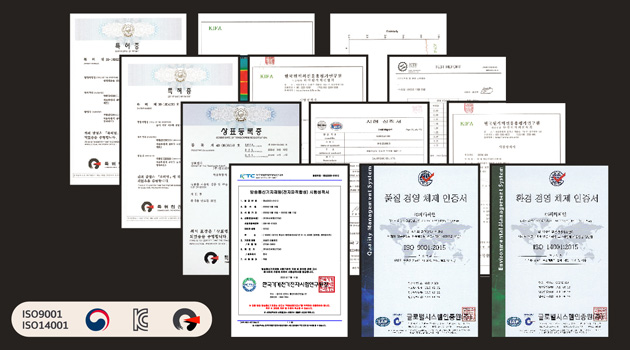 KTC성능인증, KTC신뢰성평가 시험성적서, KC전자파인증, 특허인증 승인2개 ISO9001 인증, ISO14001인증, 상품등록증 조달청지정증서, 여성기업확인서, 각종 인증서 등